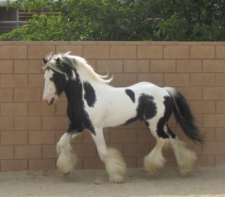 First and for most he has the temperament that has made Gypsy horse so desirable. Conformation and bone structure second to none. I guess his pictures tell the story of his main and feather. Standing a full 14.2 hands, he is an impressive stallion. His mane is a bit rubbed out at the moment.